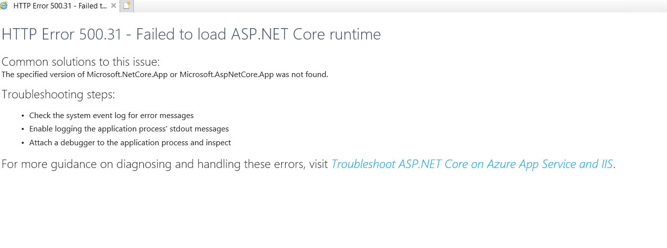 - Corrupt installation of the runtime or hosting bundle.